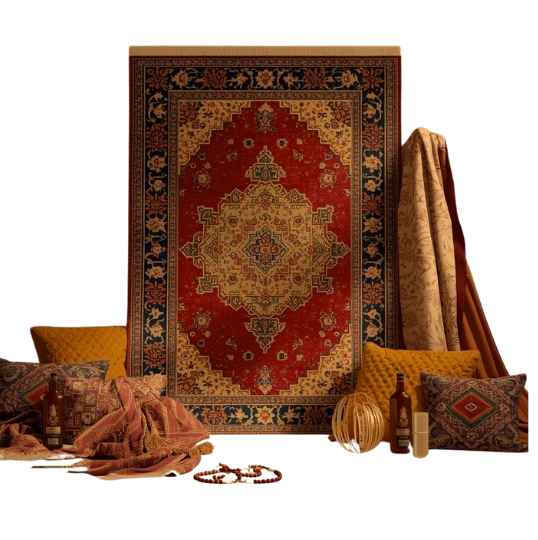 Produits de beauté bio, savons naturels et huiles essentielles pour le corps et les cheveux, accompagnés de tapis, bijoux, châles et créations artisanales.